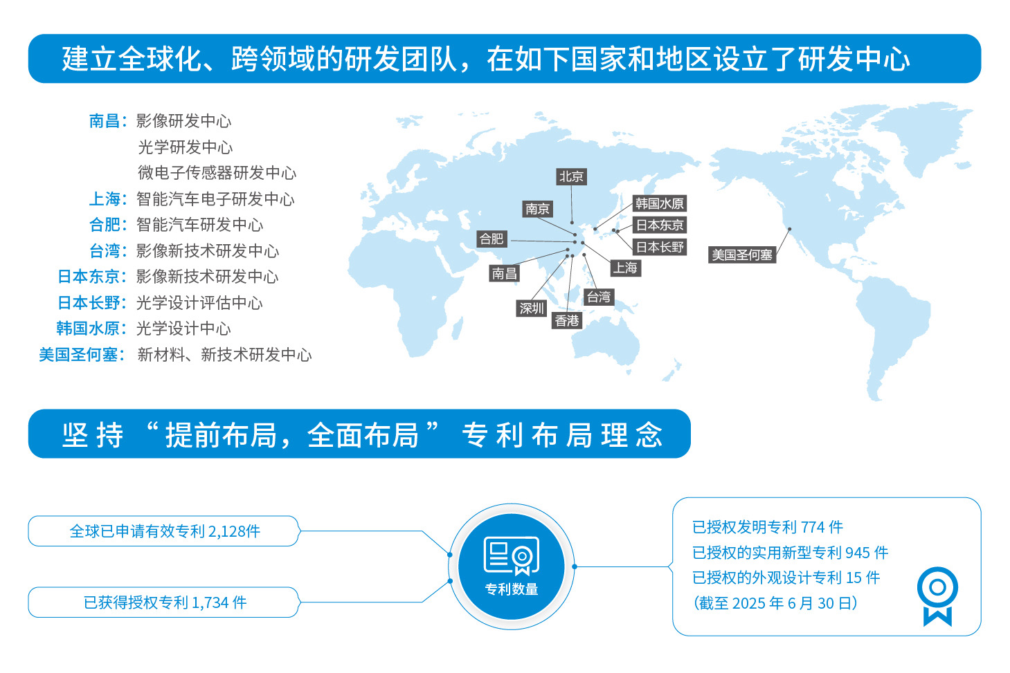 “提前布局,全面布局”是u体育专利的布局理念,布局领域涉及智能手机、智能汽车和新领域等。 截至 2025 年 6 月 30 日,公司在全球已申请有效专利 2,128件,已获得授权专利 1,734 件。其中,授权发明专利 774 件,已授权的实用新型专利 945 件,已授权的外观设计专利 15 件。